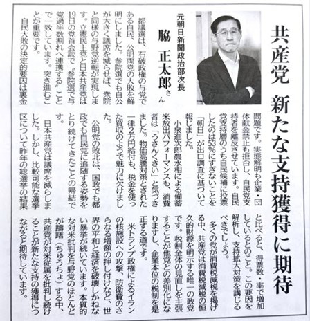 6月29日付けの「しんぶん赤旗」日曜版に、元朝日新聞政治部次長の脇正太郎さんのコメントが掲載されています。